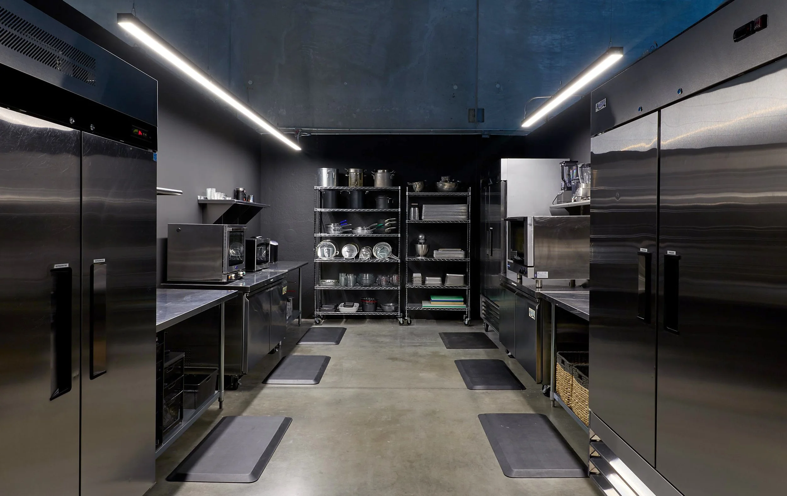 The west kitchen is stocked with everything needed for food and beverage productions including its own refrigeration and freezer storage and appliances. Attached to the west stage, and accessible via the main kitchen, this kitchen can be rented on its own, in conjunction with the west stage for smaller productions, or in addition to the main kitchen for additional food storage and preparation space.
