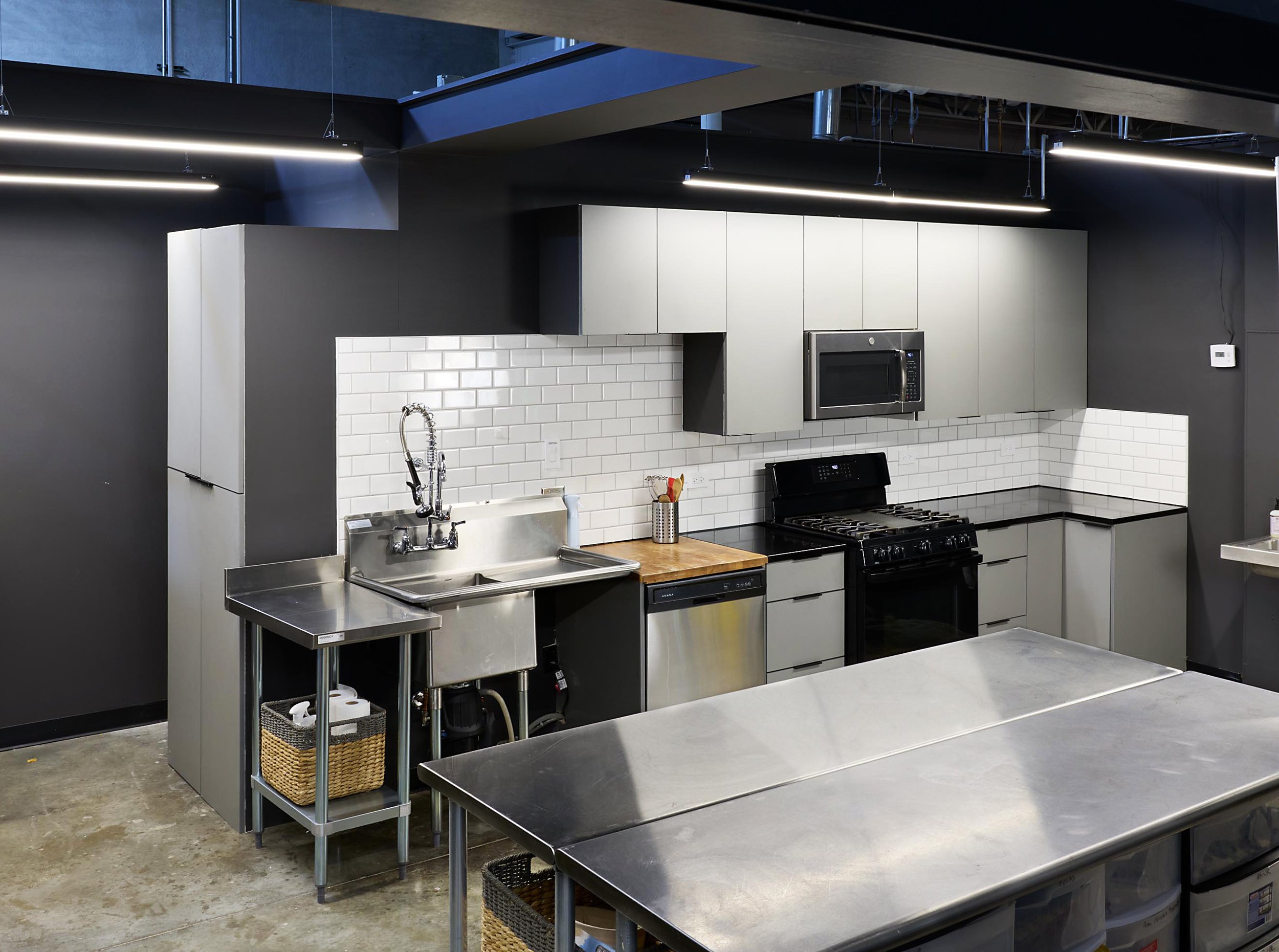The main kitchen opens into the main stage, making for seamless food and beverage productions. With ample refrigeration, freezer storage, industrial stove, fryer, multiple ovens, including conventional, convections and impinger, and every possible appliance needed, this kitchen has everything you could need for large scale food commercials.